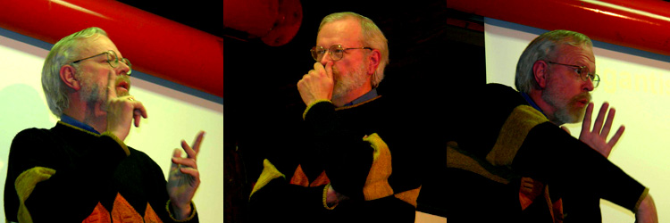 Hans-Holger Miebach referierte zum zweiten Mal in Essen, auch dieses Mal mit einem anspruchsvollen Thema. Er stellte uns Per- sönlichkeit und Lebenslauf des weltbekannten Astro-Physikers vor und erklärte seine Theorie der Schwarzen Löcher im Universum. Die Zeit reichte nicht, um das Buch ausführlich darzustellen. In der Dis- kussion und nach der Veranstaltung hatten die Zuschauer aber Gele- genheit, Fragen zu stellen und über die Veröffentlichungen ins Ge- spräch zu kommen. Christian Aengenheister moderierte die Veranstaltung locker und ge- konnt. Für eine technische Panne mussten wir uns entschuldigen: Zum ersten Mal klappte die Projektion der Schriftdolmetscher-Texte nicht. Wir versprechen, vor der nächsten Veranstaltung unsere Technik einem Gesundheits-Check zu unterziehen :-) |