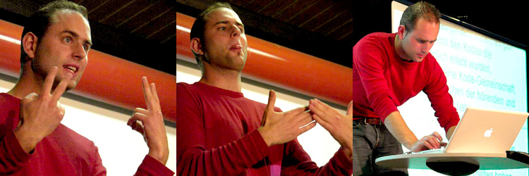 Vom 22. - 26. Juli 2007 fand der 15. Weltkongress des WFD (World Federation of the Deaf) in Madrid statt. Ca. 3000 gehörlose und hörende Teilnehmerinnen aus aller Welt besuchten über 150 Vorträge, Diskussionsveran- staltungen, Film- und Theateraufführungen. Themen- schwerpunkt des Kongresses waren "human rights for deaf people" (Menschenrechte für Gehörlose). Über diese hochinteressante Veranstaltung berichtete Kilian Knoerzer in einem lebendigen Vortrag, auf dem er auch eigene Filmberichte zeigte. ![]() |