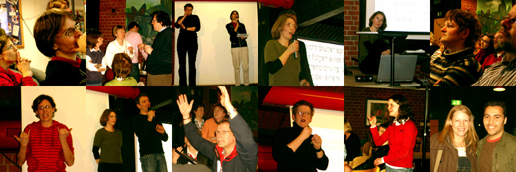 Gehörlose, schwerhörige und ertaubte Menschen haben das Recht, in immer mehr Bereichen (Soziales, Arbeit, Studium, Behörden) Dol- metscher einzusetzen. Verschiedene Gesetze regeln die Finanzierung. Aber das Wissen der gehörlosen und schwerhörigen Kunden über Be- stellung, Finanzierung und Aufgaben der Dolmetscher ist oft zu gering. Dieses Kofo konnte helfen, die Informationslücke zu schließen. Interes- sant war, dass nur wenige junge Besucher sich von diesem Thema an- gesprochen fühlten. Gefreut haben wir uns über zahlreiche schwerhö- rige Gäste. Es war ein sehr informativer Abend, der mit Filmbeiträgen aufgelockert war. Weitere Infos aus NRW unter: www.berufsfachverband-gsd-nrw.de sowie beim Bundesverband: www.bgsd.de |