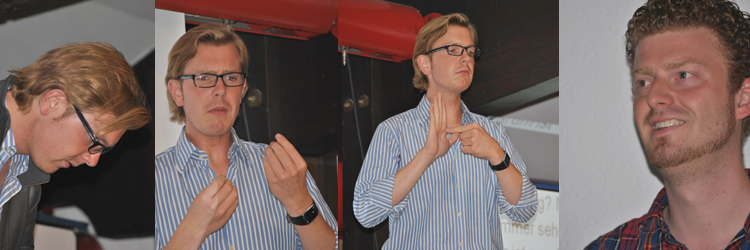 Ein spannendes Thema, denn noch vor wenigen Jahrzehnten schien es undenkbar, dass gehörlose Menschen auch Parlamente erobern und in der Politik aktiv mitmischen. Helene Jarmer im österreichischen Nationalrat ist mittlerweile vielen bekannt. In Deutschland hat es Martin Zierold in die Bezirksvertretung von Berlin geschafft. Sein Sprungbrett war eine Gruppe junger Gehörloser, die sich in der GRÜNEN JUGEND engagieren, darunter auch Lutz Pepping. Lutz, den wir schon zum zweiten Mal auf der Kofobühne begrüßen konnten, erklärte zu Beginn seines Vortrags die Bedeutung von Politik für uns alle und wies auf die große Chance hin, sich in einer Demokratie für die eigenen Interessen einsetzen zu können. Kommunikative und kulturelle Barrieren mögen dazu beitragen, dass gehörlose Menschen vor einer Zusammenarbeit mit Hörenden in der Politik zurückschrecken. Aber auch dafür nannte der Referent Lösungsmöglichkeiten. Eigene politische Erfahrungen und eine kurze Darstellung prominenter gehörloser Politiker rundeten den interessanten Vortrag ab. Leider musste an diesem Abend das Kofo gegen die Fußball-EM konkurrieren. Deutschland gegen die Niederlande wurde um 20.45 Uhr angepfiffen. Philipp Wacker hatte Uhr und Ablauf immer im Blick und bestand souverän sein Debut als Moderator. Hier kann sich jeder in Ruhe über den Referenten und das Thema informieren: