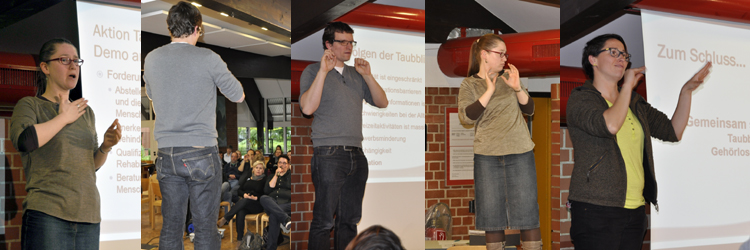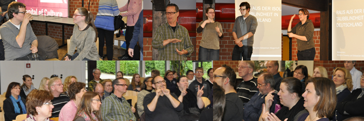 Melanie Drewke und Sebastian Wegerhoff sind beide hörsehbehindert und in Landesverbänden aktiv. Sie erklärten die Formen, Ursachen und vor allem die Folgen dieser doppelten Behinderung. Man schätzt, dass in Deutschland ca. 6.000 - 10.000 Menschen mit dieser Behinderung leben. Zu den schwerwiegendsten Folgen zählt die soziale Isolation, die durch eingeschränkte Kommunikation, Mobilität und Information verursacht wird. Allerdings werden taubblinde Menschen in Deutschland jetzt politisch aktiver: Aufmerksamkeit erregte die Demonstration taubblinder Menschen in Berlin im vergangenen Jahr. Weitere Aktionen sind geplant. Die Referenten berichteten auch über das Taubblindencamp in Seabeck/USA, das vorbildlich organisiert wird. Der Vortrag endete mit einem Aufruf an die Gehörlosengemeinschaft: "Gemeinsam sind wir stärker!" Leider - so stellte eine Diskussionsteilnehmerin fest - wurde dieses Kofo überwiegend von hörsehbehinderten und taubblinden Menschen besucht, gehörlose Besucher waren in der Minderheit. |