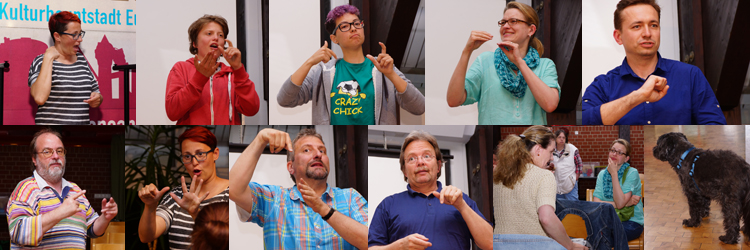 kann "in verschiedenen Kulturen unterwegs sein". Natürlich verläuft es nicht immer harmonisch, Vorurteile und Konflikte müssen angesprochen werden. Ege berichtete von einer speziellen Methode der Gegenüberstellung, die mit gut vorbereiteten Moderatoren durchgeführt wurde. Die anschließende Diskussion wurde sehr engagiert geführt. Eine Teilnehmerin berichtete auch von negative Erfahrungen mit Migranten und wünschte, dass diese sich auch öffnen müssen für unsere Gesellschaft. Es wurde auch auf die Situation gehörloser Flüchtlinge hingewiesen, die zu wenig Unterstützung der Gehörlosengemeinschaft erhalten. Ege erwiderte, dass ein entsprechendes Seminarangebot an die Landesverbände im Juli abgesagt werden musste, weil es zu wenig Anmeldungen gab. Ein Diskussionsteilnehmer wies darauf hin, dass es sehr schwierig ist, die Fähigkeiten gehörloser Migranten einzuschätzen, da sie sich nicht ausreichend in DGS äußern können. Auf jeden Fall muss man ihnen Zeit geben, sich Sprache und Kultur anzueignen. Weitere Informationen: www.deaftrain.de Kontakt zum Referenten: e.karar@signges.rwth-aachen.de |