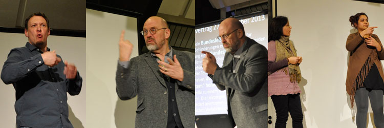![]() Wieder hatten wir ein volles Haus. Dieses Mal waren es überwiegend Besucher mittleren Alters, die wir mit Thema und Referenten locken konnten. Auch zahlreiche Teilnehmer von DGS-Kursen waren erschienen. Uli Hase (zum 8. Mal auf der Essener Kofobühne) schaffte es wieder, direkten Kontakt zum Publikum aufzunehmen. Er ließ das Licht im Saal an, damit er die Reaktionen sehen und darauf reagieren konnte. Gut verständlich erklärte er Ziele, Zeitplan und Schwierigkeiten bei der Umsetzung des Bundesteilhabegesetzes. Ein Erfolg für Betroffene und Verbände sind z.B. die Herauslösung der Eingliederung aus der Sozialhilfe, die Anhebung der Einkommens- und Vermögensfreibeträge, die Einführung des Merkzeichens TBL und der Aufbau der Ergänzenden Unabhängigen Teilhabeberatung. Aber die Ausgaben sind gedeckelt. Um neue Kosten zu vermeiden, gibt es im Gesetz ungenaue Formulierungen; z.B. sollen für ehrenamtliche Tätigkeiten nur "angemessene" Aufwendungen erstattet werden...solche und ähnliche Formulierungen ermöglichen es dem Staat, finanziell engere Grenzen zu ziehen. Aus diesem Grund ist auch kein Teilhabegeld gesetzlich verankert worden. Uli Hase wies darauf hin, dass nur wenige Gehörlose die Möglichkeiten eines Persönlichen Budgets nutzen.Nach der Pause stellten sich MitarbeiterInnen von drei Essener EUTB-Beratungsstellen vor, erklärten ihre Arbeit und beantworteten Fragen des Publikums:- EUTB-Beratungsstelle beim Landesverband der Gehörlosen und Gebärdensprachgemeinschaft NRW, bei der Deutschen Gesellschaft für Taubblindheit und beim Landesverband des Deutschen Schwerhörigenbundes NRW. Der Referent stellt uns seine Präsentation zum Nachlesen zur Verfügung.Auf der Website der Deutschen Gesellschaft ist ein Artikel von Ulrich Hase aus "Das Zeichen" (Ausgabe 106) verlinkt und mit DGS-Videos erklärt.