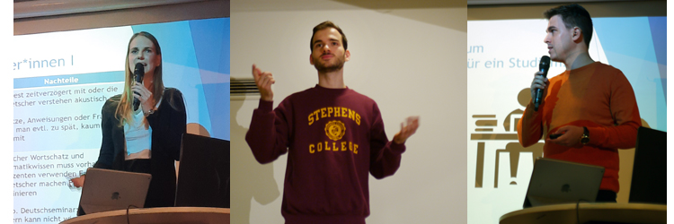 man sich schon vor Beginn eines Studiums darauf vorbereiten kann. Drei Studierende mit unterschiedlichen Hörbehinderungen und Studienfächern berichteten über ihre Erfahrungen und gaben Tipps für einen guten Start ins Studium, hier nur eine kurze Zusammenfassung ihrer wichtigsten Empfehlungen: - Man muss starkes Interesse am Studienfach haben, dann hat man auch die Motivation und das Durchhaltevermögen, um schwierige Situationen zu meistern. - Ein selbstbewusster, offener Umgang mit der Hörbehinderung gehört auch zu den Voraussetzungen für ein erfolgreiches Studium. - Wenn man mit Freunden gemeinsam studiert, kann man sich über Erfahrungen austauschen und fühlt sich nicht isoliert. Auch eine aktive Freizeitgestaltung – Sport, Kultur oder private Treffen – kann das Studium erleichtern. - Man sollte auch davon ausgehen, dass ein Studium ohne entsprechende Hilfen (Dolmetscher und/oder technische Hilfen) kaum zu schaffen ist. - Das erste Semester ist oft das schwierigste. Man muss sich an der Hochschule orientieren, mit Technik und Dolmetschenden klarkommen, Kontakte knüpfen. Das ist aber kein Grund, aufzugeben. Denn die Erfahrung zeigt: Danach wird es leichter. Ganz praktisch beginnt die Vorbereitung mit zahlreichen Anträgen: - Mit einem Härtefallantrag (HNO-Ärztin bescheinigt z.B. die Gehörlosigkeit) wird man bei der Wahl des Studienortes bevorzugt. Auf dem Portal hochschulstart.de kann man sich bewerben. - Den BAföG-Antrag stellt man am besten digital – online-Anträge werden schneller bearbeitet. - An der Hochschule wendet man sich zuerst an