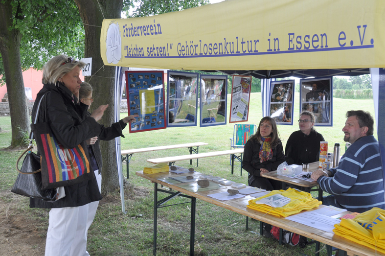 Seit über einem Jahrzehnt ist er Tradition, der "Tag der Begegnung", zu dem der Landschaftsverband Rheinland (LVR) Jahr für Jahr zahlreiche Institutionen behinderter und nichtbehinderter Menschen plus zigtausende Besucher einlädt. So war es auch in diesem Jahr, doch diesmal gab es am 27. Juni 2010 einen Bruch mit der Tradition: Während die Veranstaltung üblicherweise im Archäologischen Park in Xanten stattfindet, strömten Aussteller und Besucher in diesem Jahr in den Grugapark in der Kulturhauptstadt Essen. "Zeichen setzen!", seit vielen Jahren in Xanten dabei, nutzte diesmal natürlich seinen Heimvorteil und genoß den wunderschönen Standort unter alten Bäumen, zwischen Blumenbeeten und kunstvollen Arrangements. Der LVR als Veranstalter war in diesem Jahr einer von vielen Institutionen geäußerten Bitte gefolgt und hatte Aussteller aus dem Gehörlosen- und Hörbehindertenbereich sehr nachbarschaftlich plaziert, so daß sich in der Nähe der Dahlienarena für einen Tag ein kleines "Gehörlosen-Dorf" zusammenfand. Der Wettergott meinte es an diesem Sonntag etwas zu gut mit uns und läutete kraftvoll die erste Hitzewelle dieses Sommers ein, doch auch das am Nachmittag stattfindende WM-Spiel konnte den Besucherandrang nicht bremsen. Es war ein wunderschöner Tag in toller Atmosphäre, viele Begegnungen mit lange nicht gesehenen Bekannten machten dem "Tag der Begegnung" alle Ehre. Wir freuen uns auf die Fortsetzung der Tradition und auf den nächsten "Tag der Begegnung", der in 2011 wieder in Xanten stattfinden wird! |